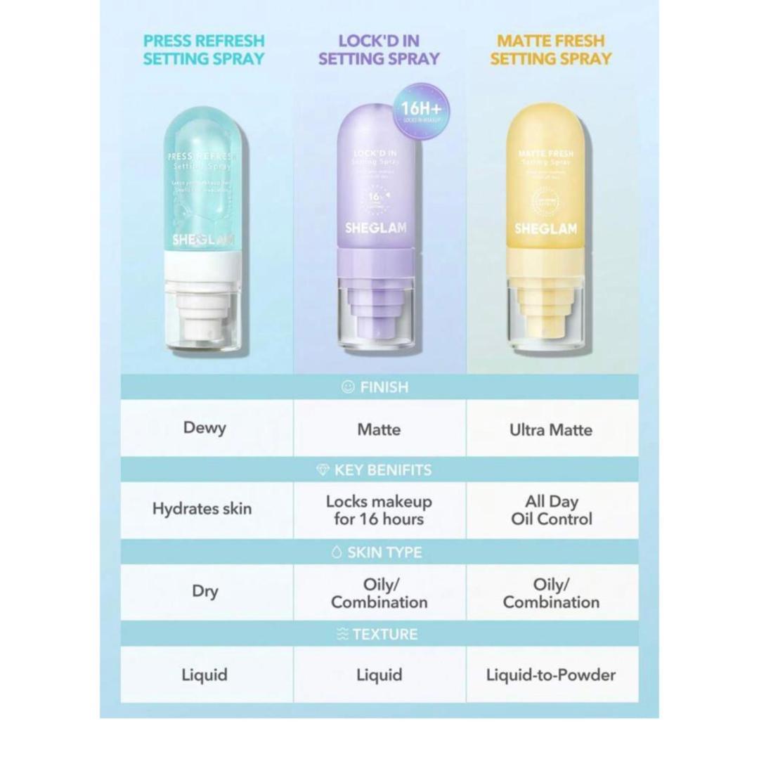 این اسپری فیکس مناسب پوست‌های چرب و مختلط طراحی شده است و قادر است در طول 24 ساعت، آرایش را سالم و بدون تغییر نگه دارد. این اسپری روی پوست جلوه‌ای کاملا مات ایجاد می‌کند. همچنین ترشح چربی پوست را کنترل کرده و از ایجاد برق ناشی از چربی جلوگیری می‌کند.