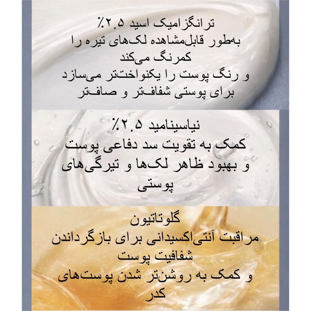 • حاوی ۵٪ ترانگزامیک اسید برای کاهش لک و تیرگی