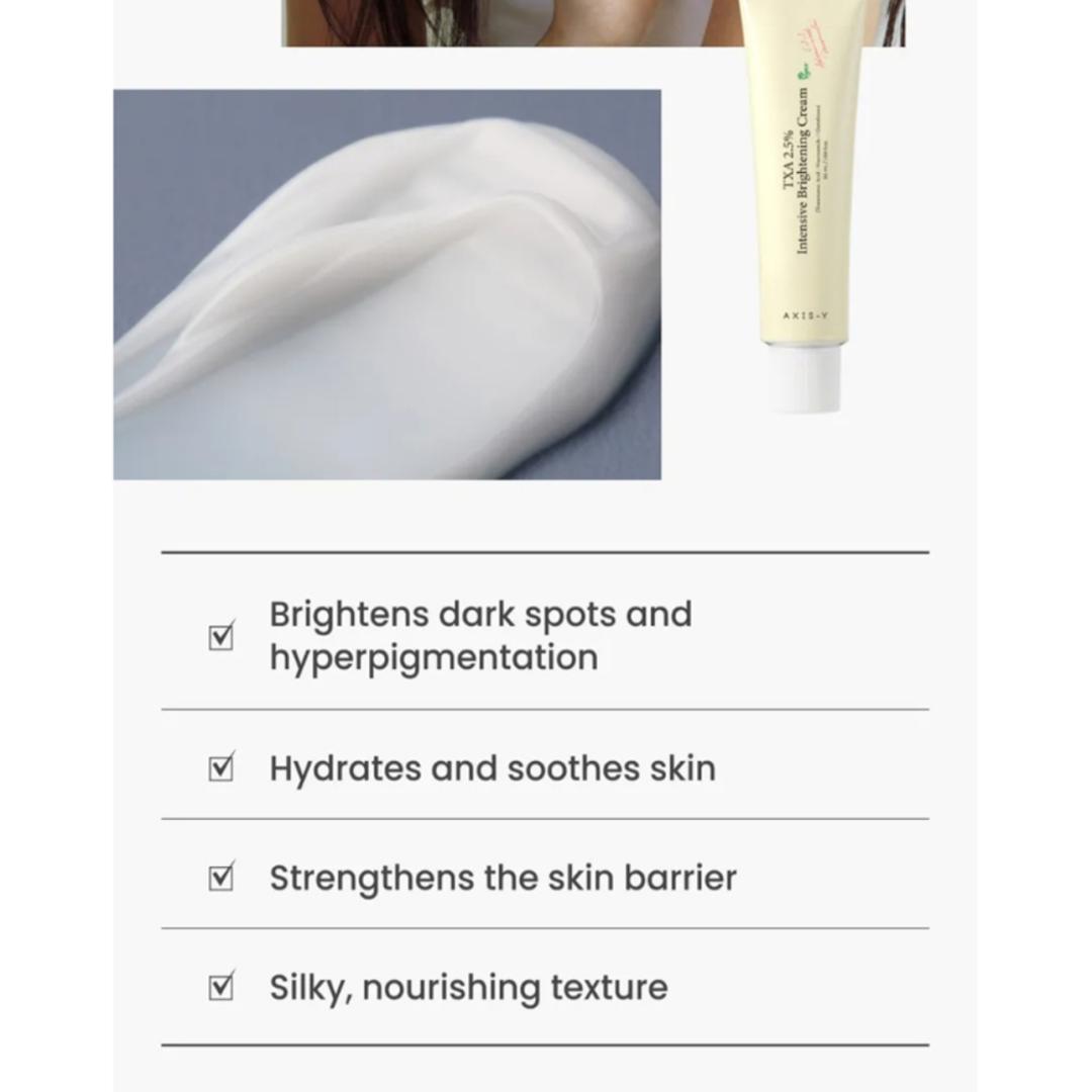 کرم TXA 5% Intensive Brightening Cream از برند Axis‑Y یک محصول تخصصی برای روشنتر شدن پوست، کاهش لکهای تیره و یکنواختسازی رنگ چهره است. این کرم با ۵٪ ترانگزامیک اسید (TXA) بهطور مؤثر به مهار تولید ملانین کمک میکند و ظاهر لکهای ناشی از آفتاب، جای جوش و تیرگیهای مقاوم را کاهش میدهد.